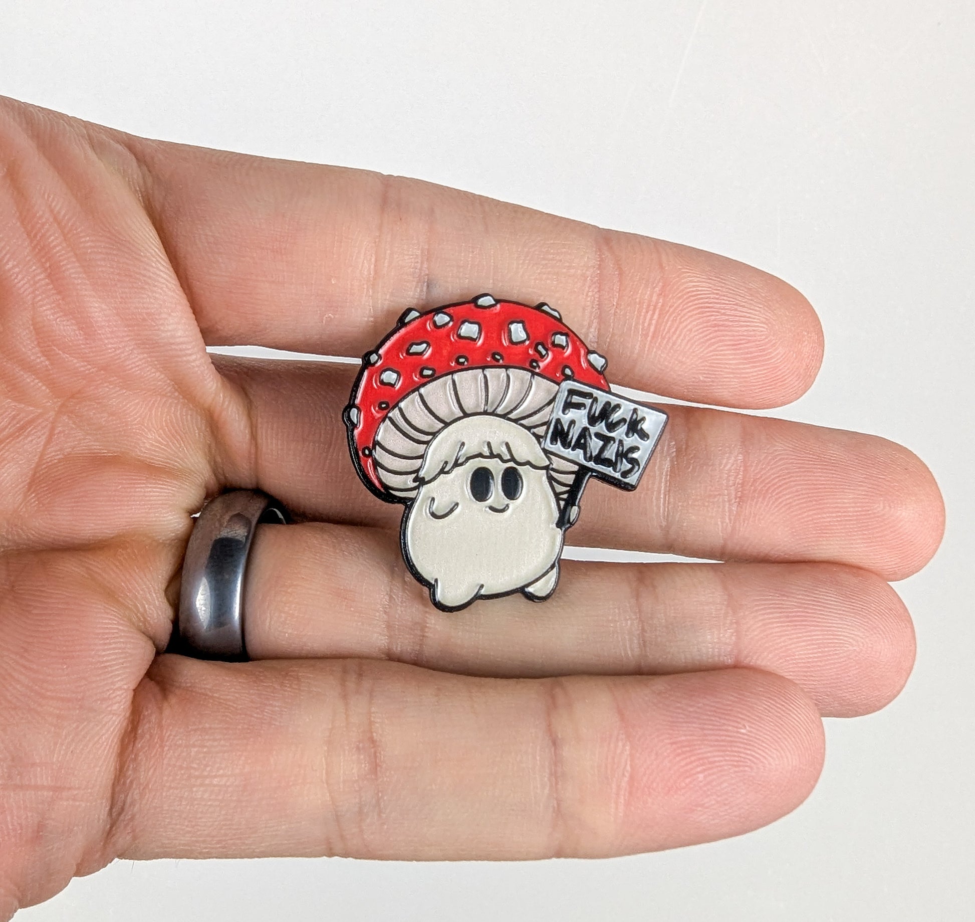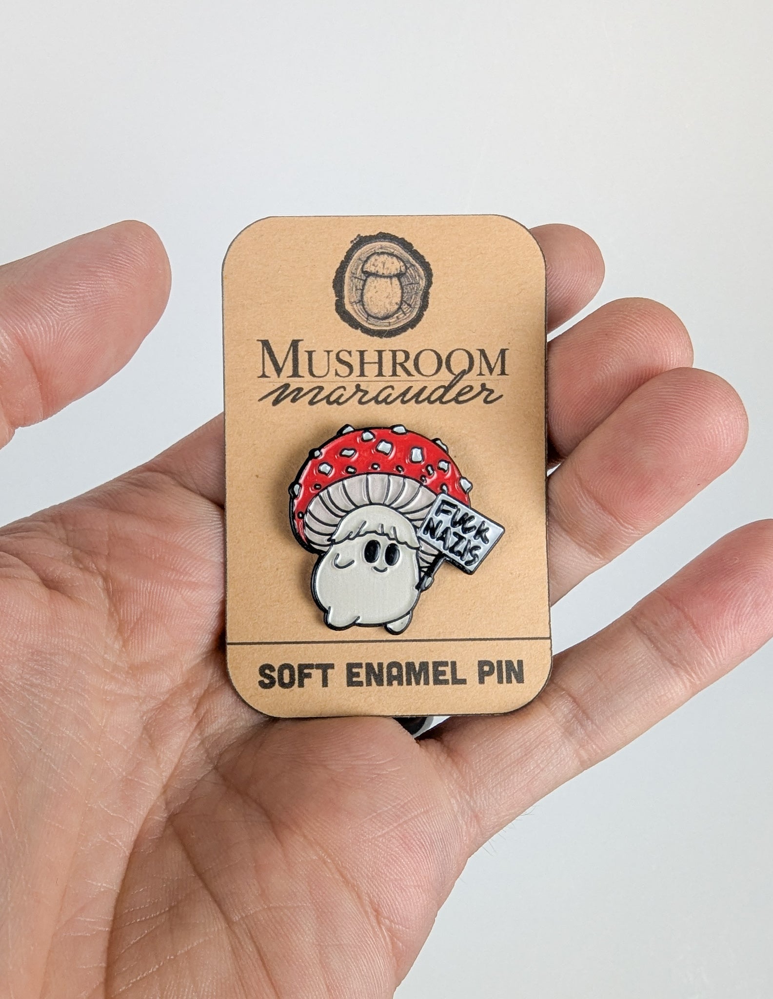 On top of all that, this adorable Amanita is morally (morelly?) sound! Proudly holding his "Fuck Nazis" sign, this little guy doesn't put up with reich-wing bullshit. If you feel the same, you were probably destined to own one.