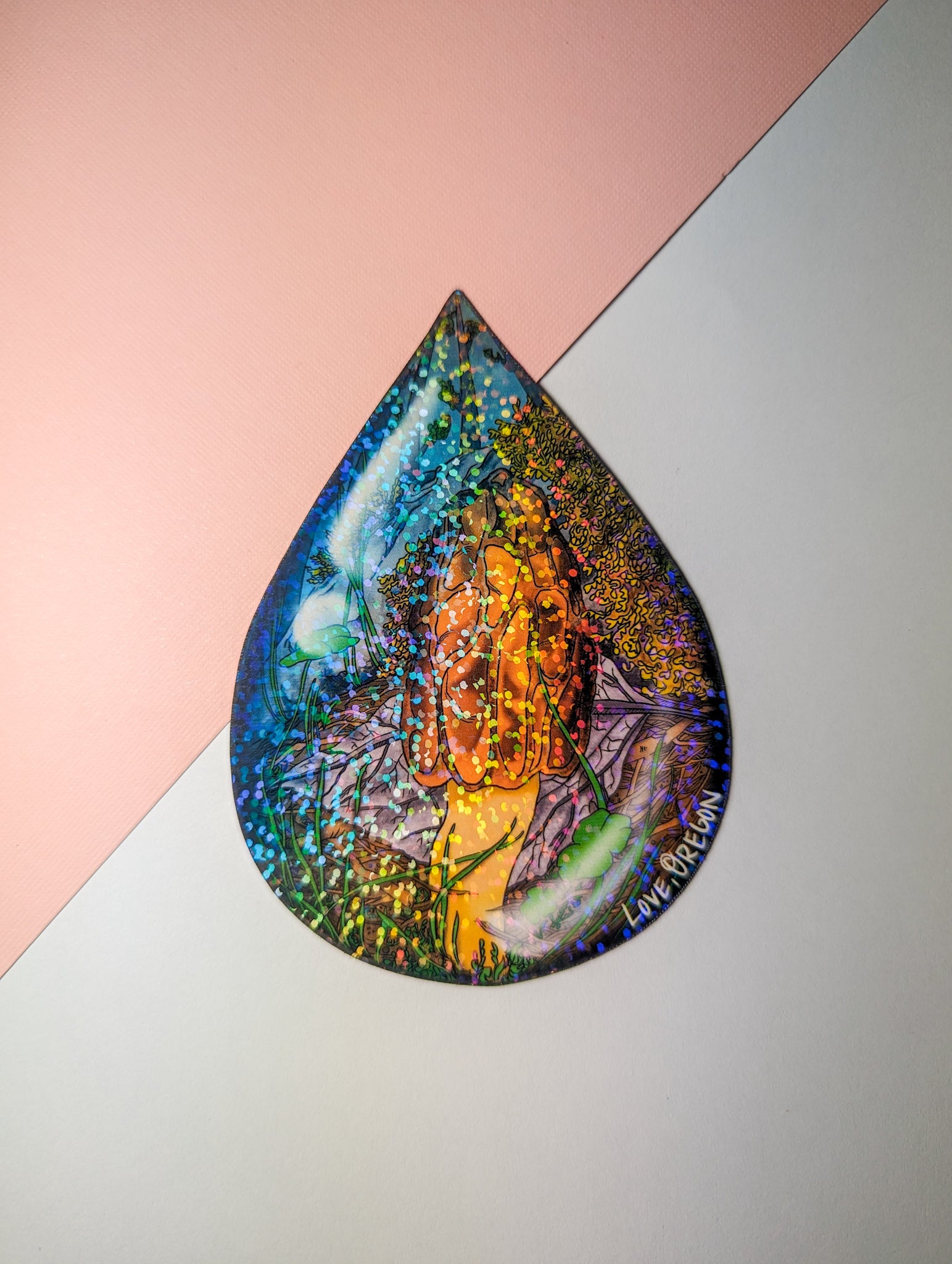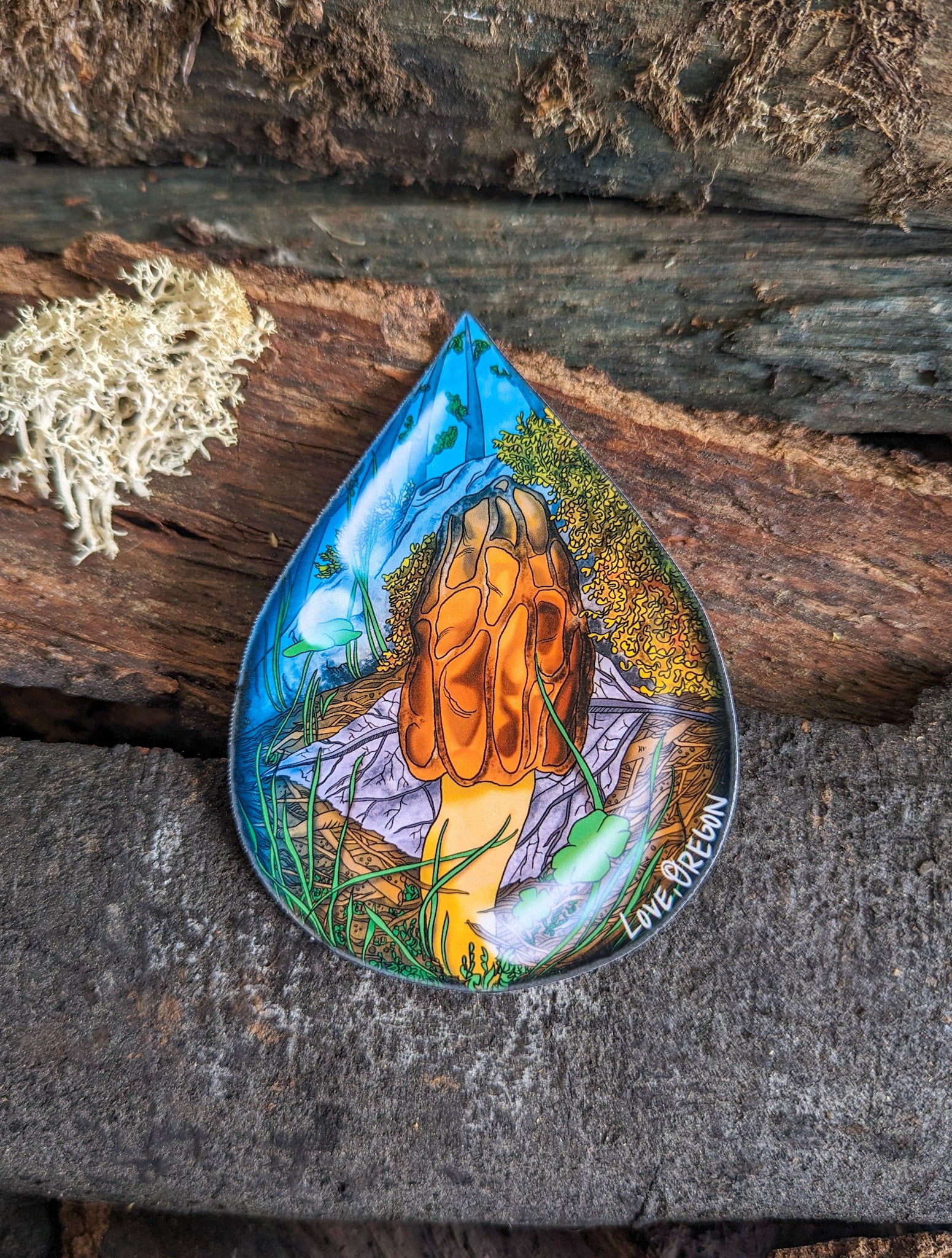 This Morel Mushroom Raindrop Sticker is a proud member of our "Love, Oregon" trio! It is a unique and vibrant rendering created by artist Suzi McCrae, based off of a photo of a Morel Mushroom that her husband Adam took in Northern Oregon. (Original Photo shown in pic 3). A loving tribute to the gifts that Oregon continues to provide us, these stickers go great on your water bottle and make fantastic gifts. 🥰