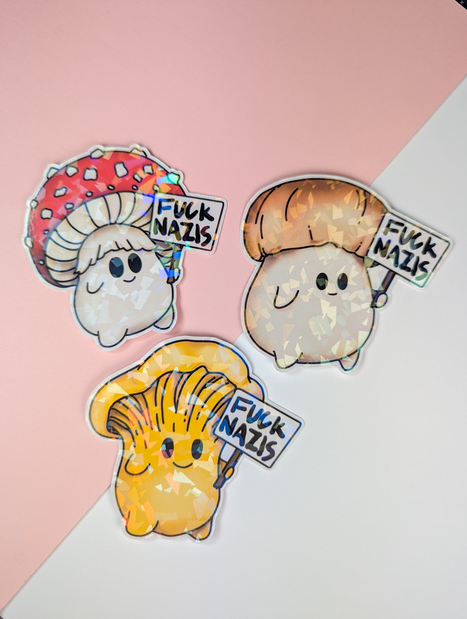 "Fuck Nazis" Mushroom Sticker Trio | Chanterelle, Amanita and Porcini Mushrooms Holding Picket Signs